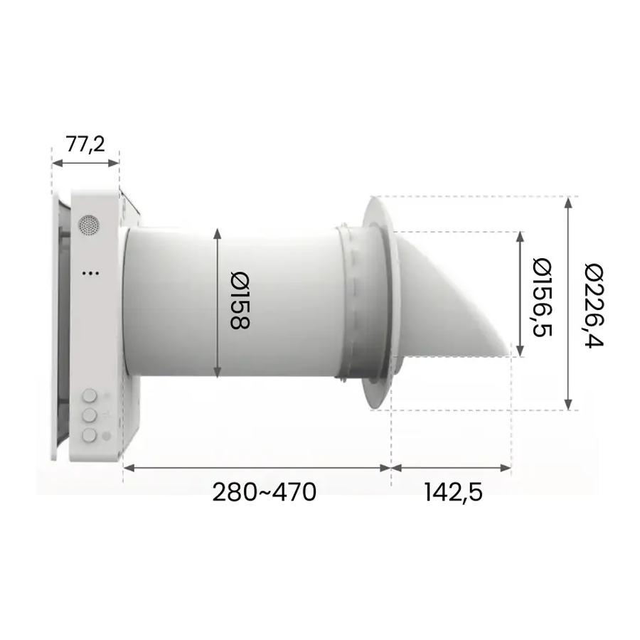 Ugradnja se izvodi kroz jednu rupu promjera 170–180 mm, poput standardne rupe za napu. Uređaj se umeće iz unutrašnjosti, bez potrebe za pristupom vanjskoj strani fasade.