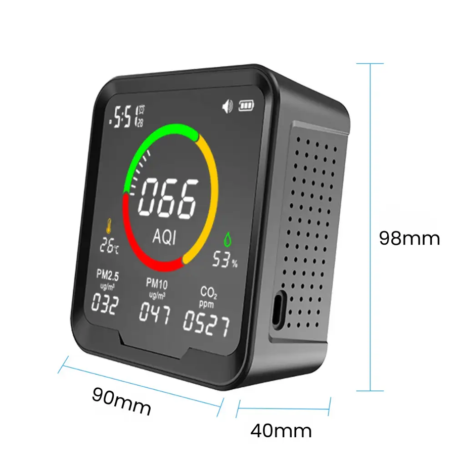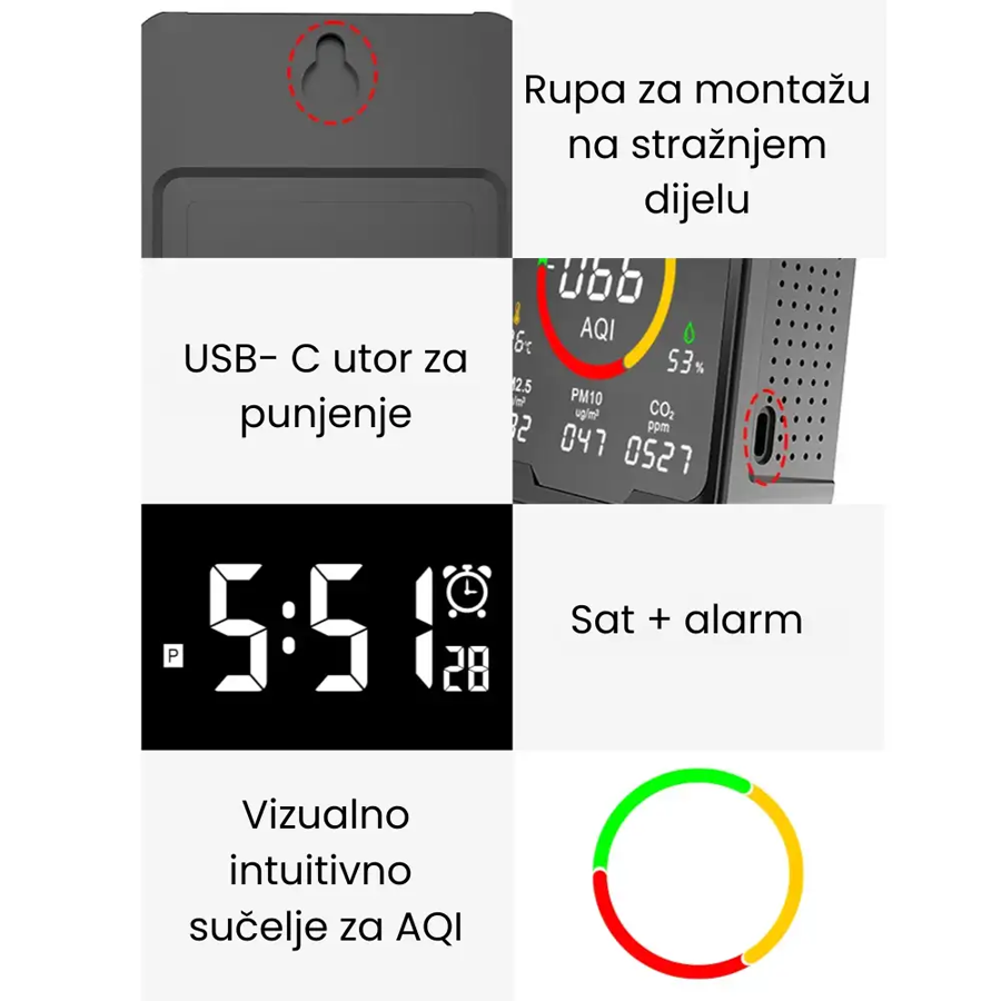 Pouzdani IAQ monitor koji mjeri CO2, PM2.5, PM10, temperaturu i vlažnost. Precizni senzori, jasan prikaz i jednostavno korištenje uz USB-C napajanje.