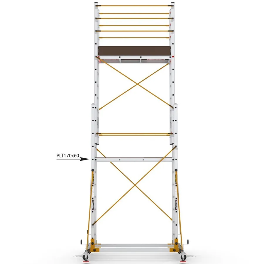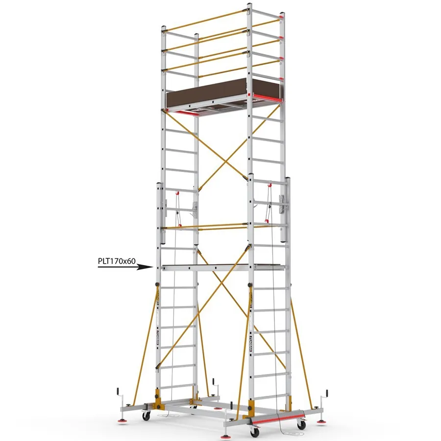 Robusni aluminijski profili osiguravaju visoku krutost konstrukcije i minimalno savijanje pod opterećenjem. Čelični stabilizatori i zaključavajući kotači dodatno smanjuju pomicanje tijekom rada, dok protuklizna radna platforma omogućuje siguran oslonac u svim uvjetima.