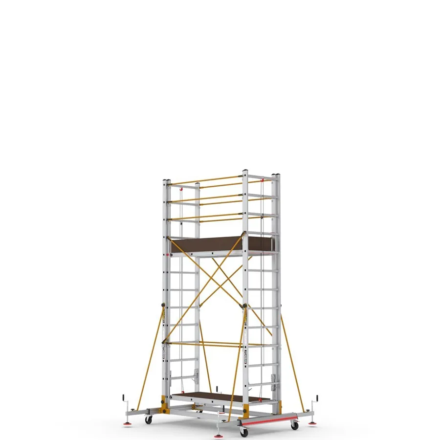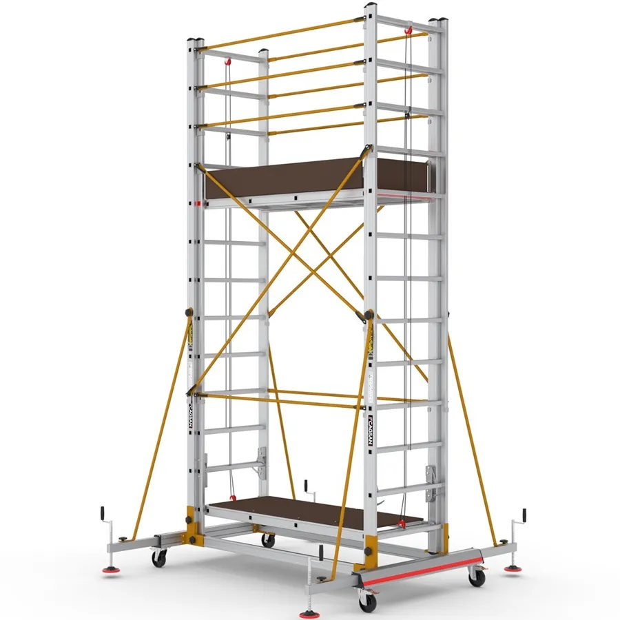 Integrirani sustav užadi omogućuje jednostavno podizanje i spuštanje radne platforme na željenu visinu, bez potrebe za rastavljanjem konstrukcije. Time ova pokretna skela postaje idealna za radove gdje se visina pristupa često mijenja, primjerice kod održavanja visokih fasada, industrijskih hala, skladišta i servisnih zahvata na većim visinama.