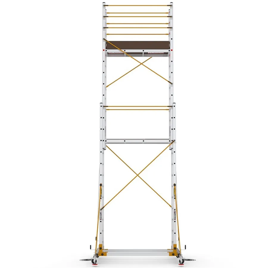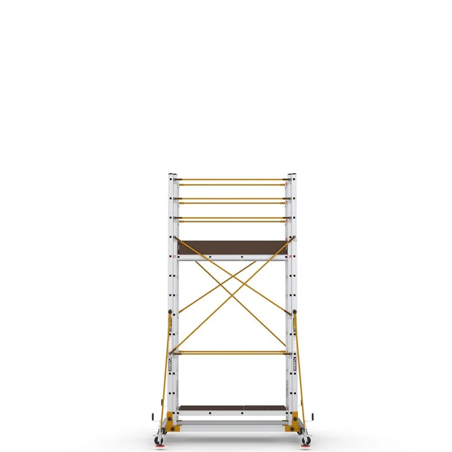 Robusni aluminijski profili osiguravaju visoku krutost konstrukcije i minimalno savijanje pod opterećenjem. Čelični stabilizatori i zaključavajući kotači dodatno smanjuju pomicanje tijekom rada, dok protuklizna radna platforma omogućuje siguran oslonac u svim uvjetima.