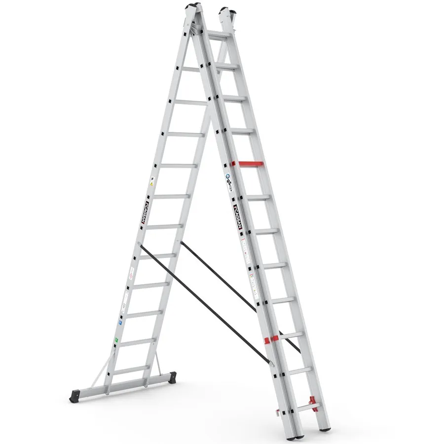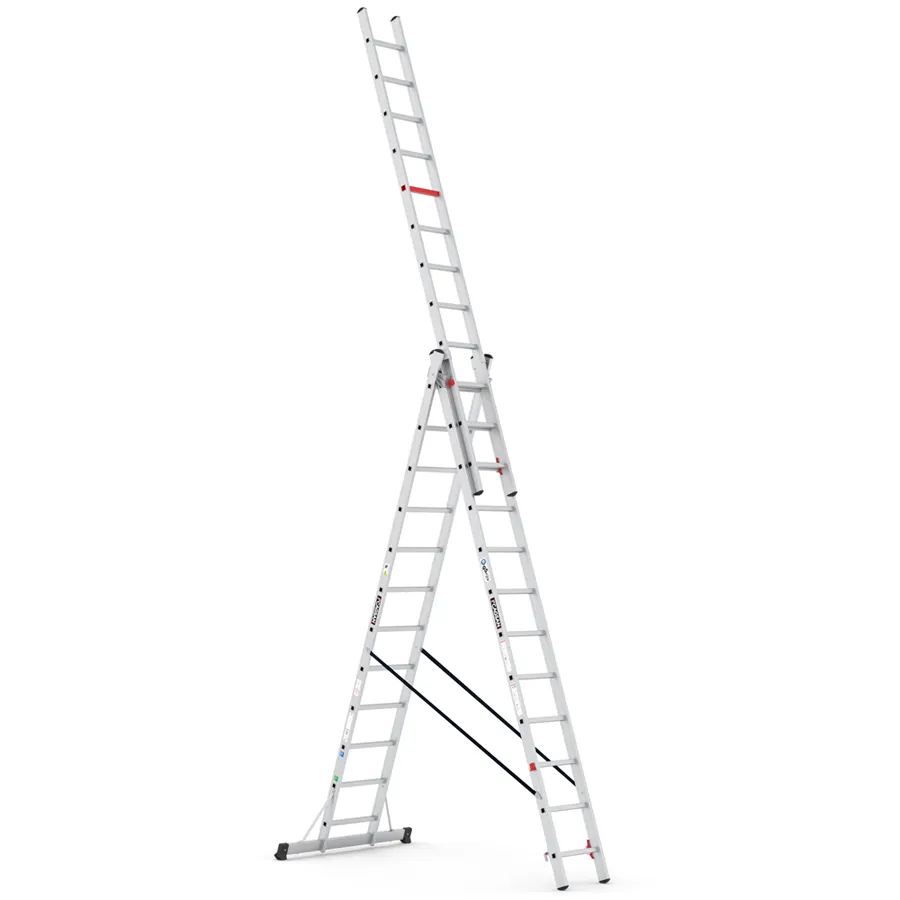 Kombinirane trodjelne aluminijske ljestve 3 × 12 gazišta pružaju vrlo velik doseg i stabilan oslonac za profesionalne montaže, servise i tehničke radove.