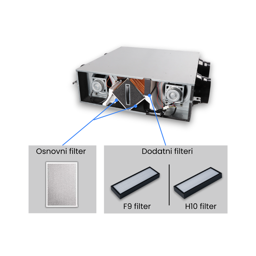 Standardna filtracija obuhvaća G3 filter, a kod modela s utorom moguće je dodati F9 ili H10 HEPA filtere. Time se osigurava poboljšana zaštita od finih čestica, alergena i bakterija, što je posebno važno za kućanstva s osjetljivim osobama ili većom koncentracijom zagađenja.