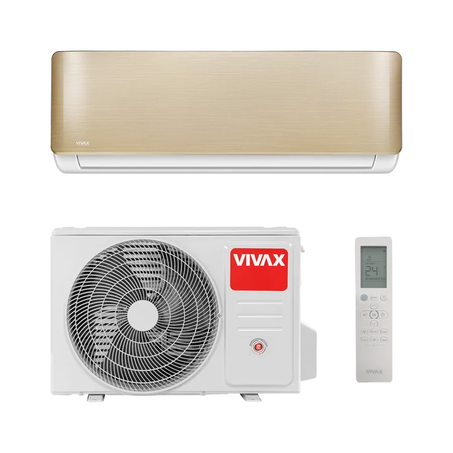 Vivax R+ Design Zlatni 3,5 kW klima uređaj nudi snažno hlađenje, vrhunsku energetsku učinkovitost i stabilan rad u hladnijim uvjetima, uz luksuzni zlatni dizajn.